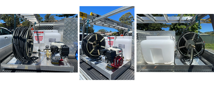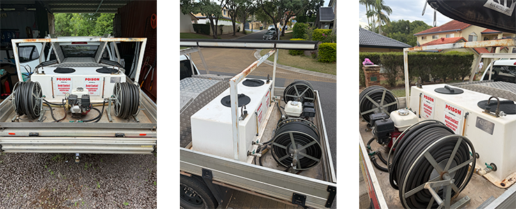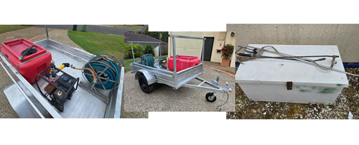 Purpose-built pest control trailer fitted out and ready for work. Includes pest control equipment: tank, motor pump and hose; also a secure, lockable storage box—ideal for safe storage and transport of chemicals, tools, and gear.